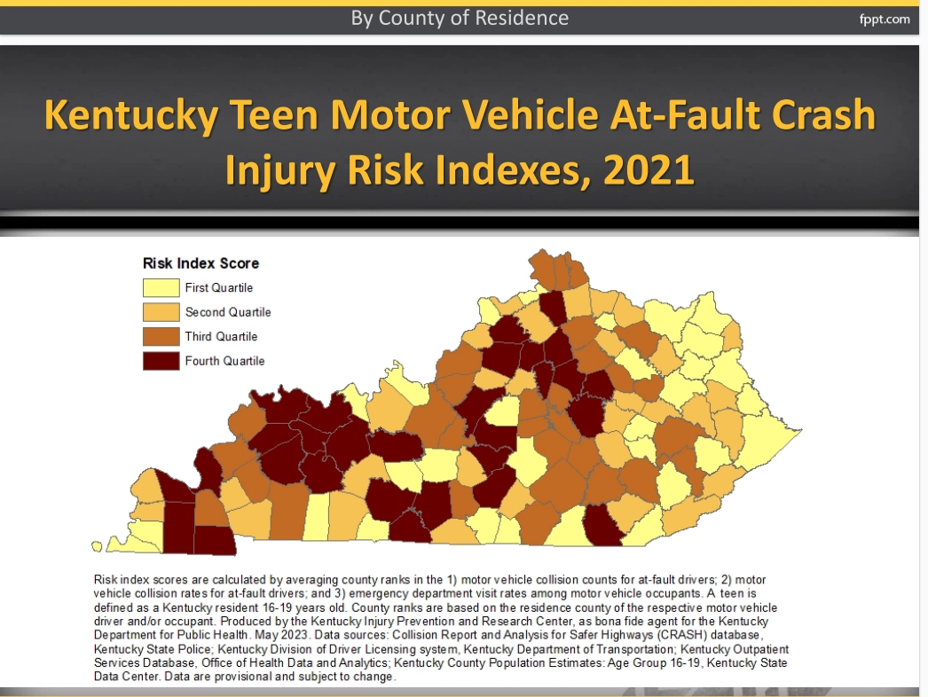 In a recent report, Kentucky At-Fault Teen Driver Motor Vehicle Crashes, 2021 (Kentucky At-Fault Teen Driver Motor Vehicle Crashes_2021_final.pdf), Bourbon County was ranked in the third quartile for teen motor vehicle at-fault crash injury risk. This means Bourbon County has more teen at-fault crash injuries than most counties in Kentucky, but it’s not among the very worst—it’s in the upper-middle group.